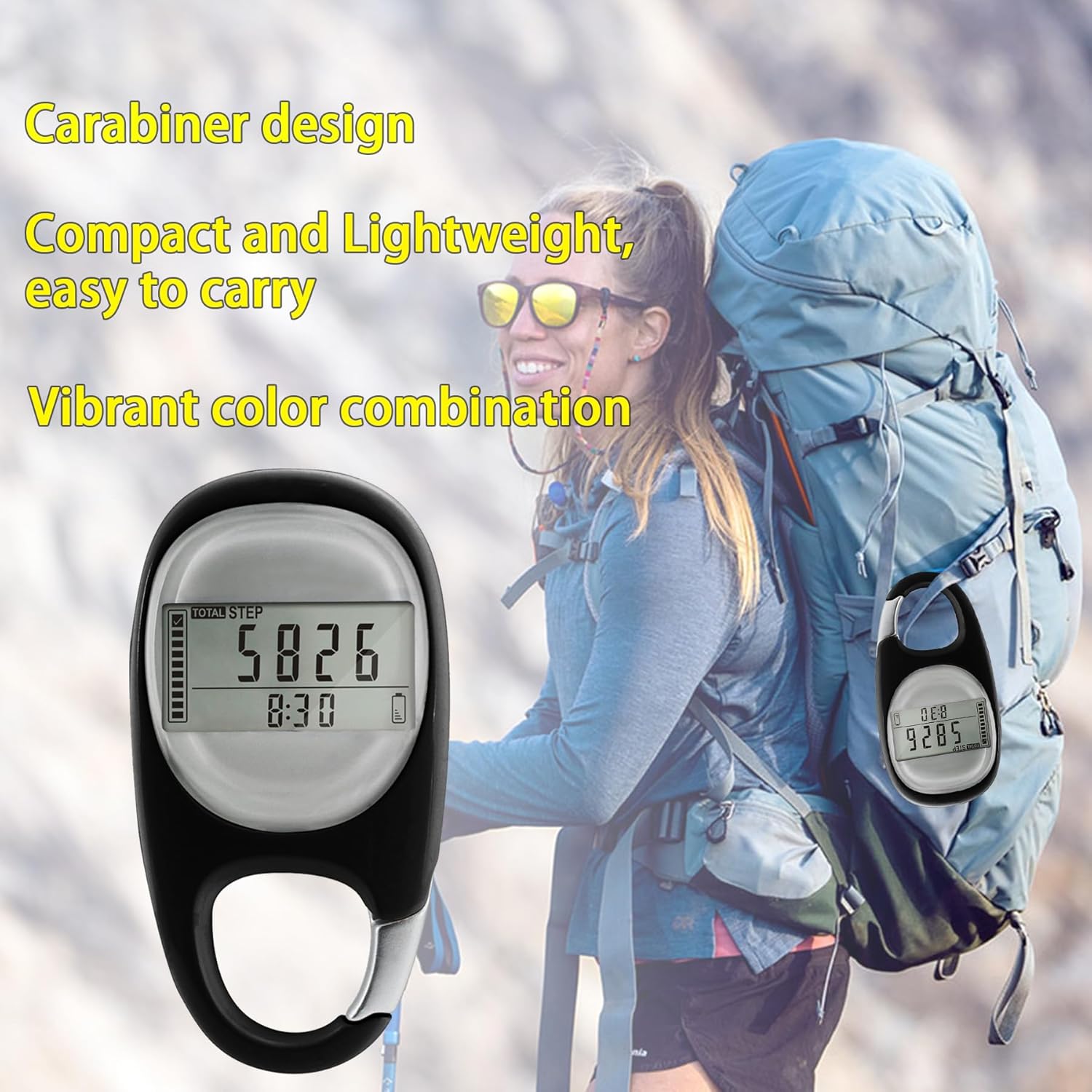 Equipped with a clear LCD display, easily view your step count, distance traveled, and calories burned at a glance. The compact design and convenient carabiner clip allow you to securely attach the pedometer to your clothing or bag for effortless carrying throughout your day.